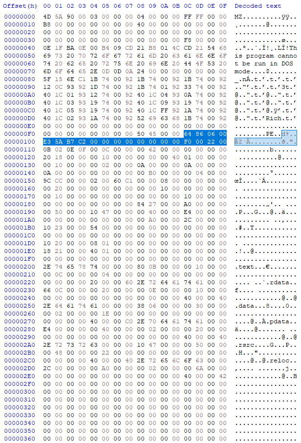 Signature : "50 45 00 00"의 4Byte 공간. ASCII Code로 PE 라는 문자열을 나타내며 PE 구조를 가진 파일이라는 것을 의미한다.
